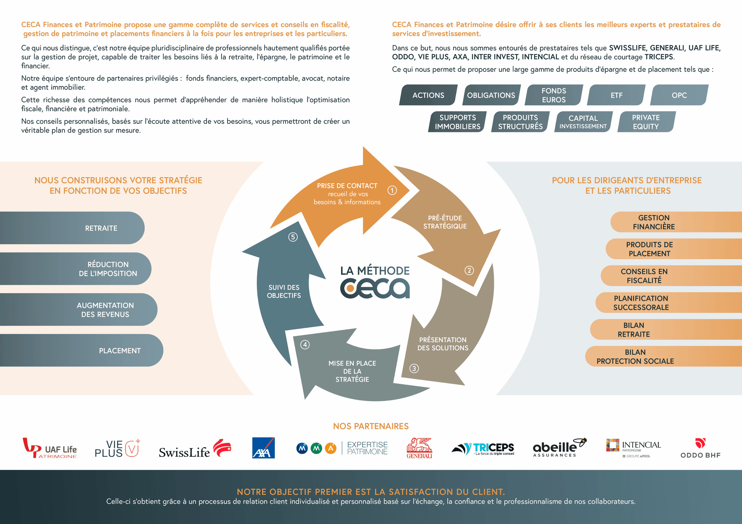 Notre objectif premier est la satisfaction du client. Celle-ci s’obtient grâce à nos solutions individualisées et personnalisées. Elles nécessitent l’écoute attentive de nos conseillés. Nos études financières et patrimoniale sont réalisées avec un haut niveau de qualité obtenu grâce à nos habilitations, à l’application des normes réglementaires (directives de l’association professionnelle CNCGP) et à l’utilisation de nos Progiciels en patrimoine et allocations financières.